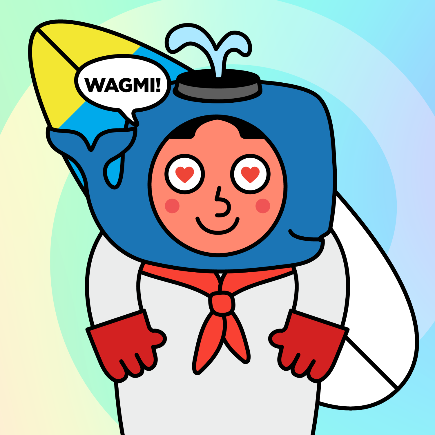 ArmsWhite33.38%BackgroundOcean3.29%CheekRosy23.73%DialogueWAGMI!3.23%EyesHeart1.65%Face ColourOrange22.69%HairCentre Parting10.07%Head MiddleBlue Sperm Whale0.34%Head TopLight Splash2.26%Left HandRed32.25%MouthBig Smile19.64%NoseRound21.67%Right HandRed32.25%ShirtRed Bandana1.31%Special ToolBlue Board0.34%TribeNeo-Capitalist20.02%