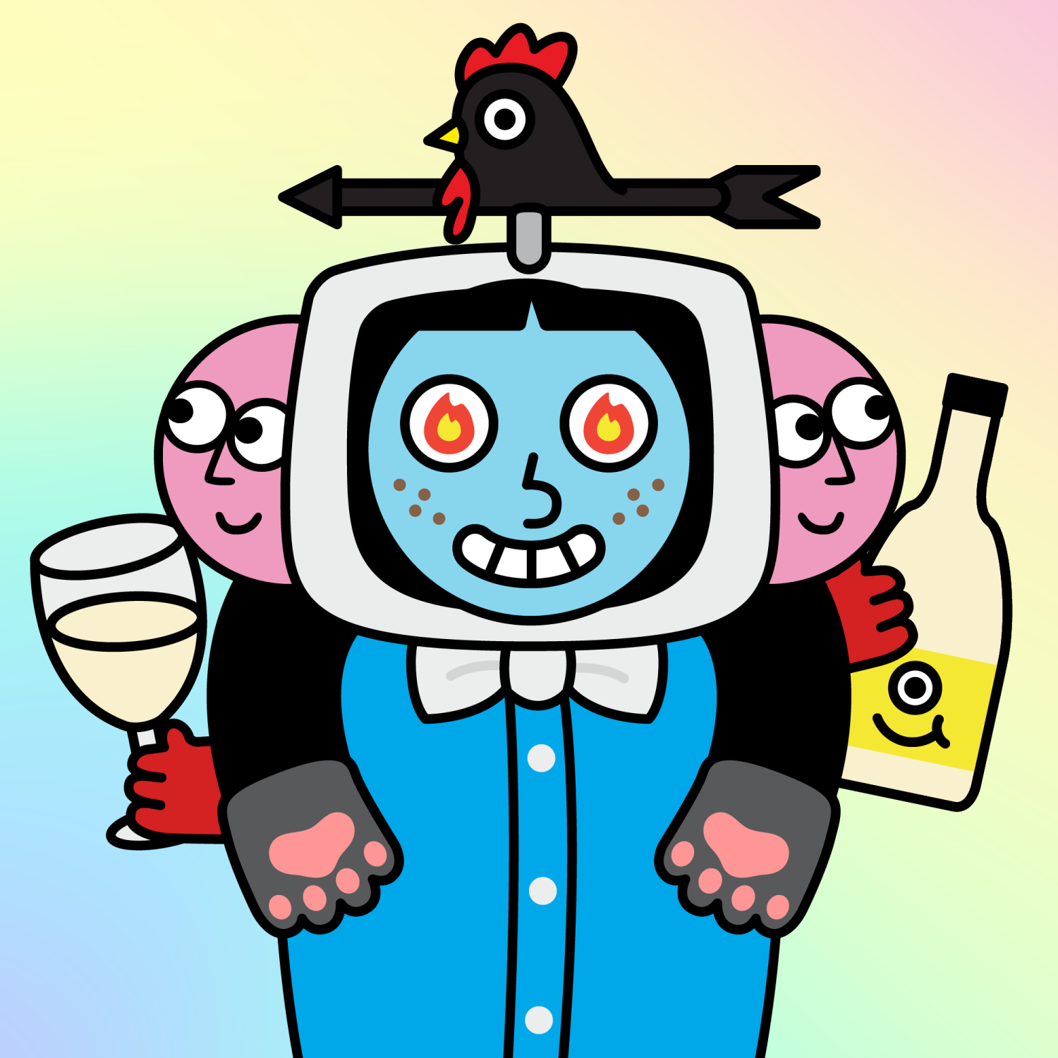 ArmsBlack33.28%BackgroundDesert4.69%CheekFreckles3.67%EyesFire1.79%Face ColourSky3.69%HairThick Fringe9.57%Head MiddleHappy1.88%Head TopBlack Weathervane0.21%Left HandGrey Paw1.62%MouthTeethy10.18%NoseRound21.67%Right HandGrey Paw1.62%ShirtWhite Bowtie0.82%Special ToolChampagne0.50%TribeConnector20.00%