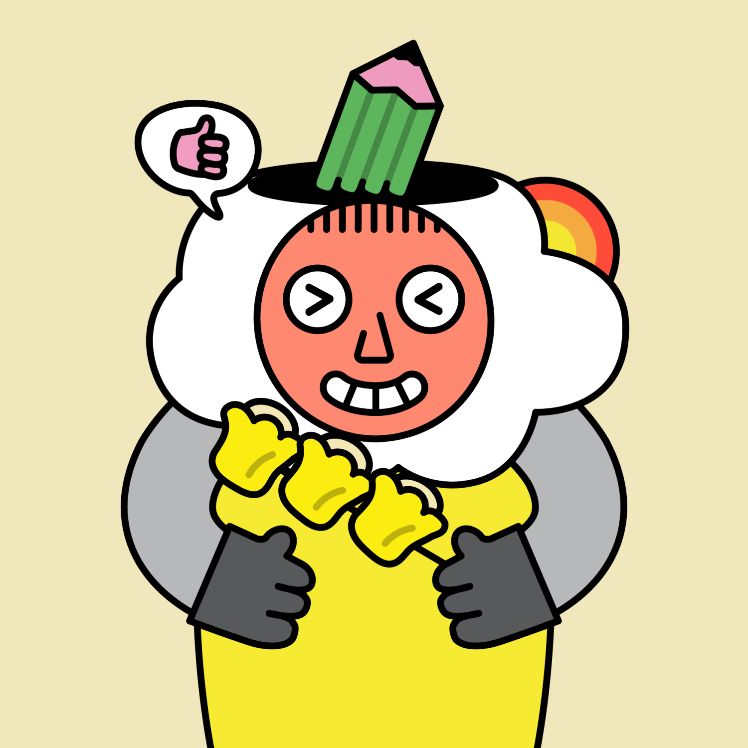 ArmsGrey31.22%BackgroundEarth11.50%DialogueThumbs Up11.09%EyesScrunched5.58%Face ColourOrange22.69%HairThin Fringe10.61%Head MiddleRainbow Cloud1.01%Head TopGreen Pencil1.31%Left HandGrey28.85%MouthTeethy10.18%NoseTriangle21.33%PropSiu Mai0.59%Right HandGrey28.85%ShirtPlain Yellow7.90%TribeDreamer19.99%