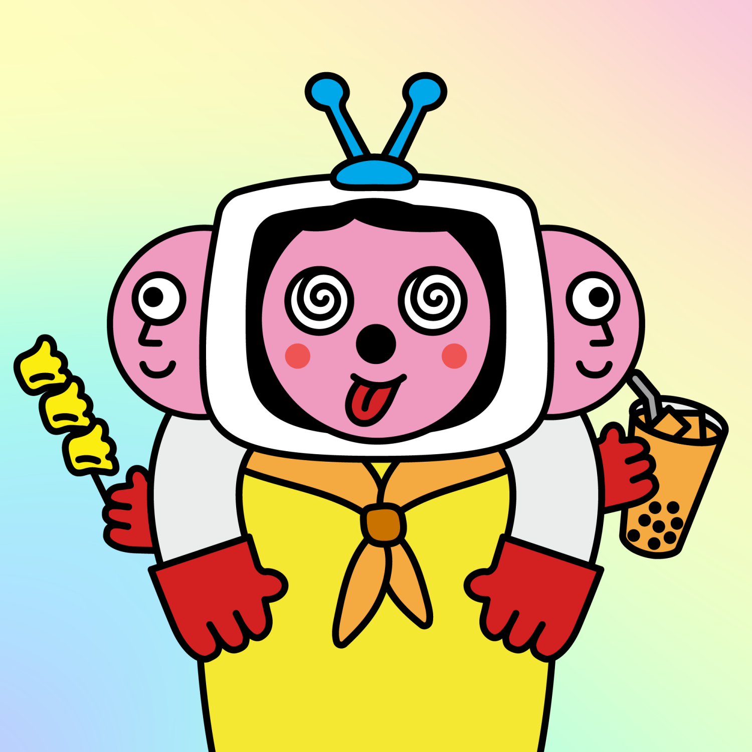 ArmsWhite33.38%BackgroundDesert4.69%CheekRosy23.73%EyesDizzy6.21%Face ColourStrawberry46.38%HairSide Fringe10.18%Head MiddleFocused1.80%Head TopBlue Antenna1.72%Left HandRed32.25%MouthTongue Out2.06%NoseBlack3.70%Right HandRed32.25%ShirtOrange Bandana1.20%Special ToolBubble Tea0.61%TribeConnector20.00%