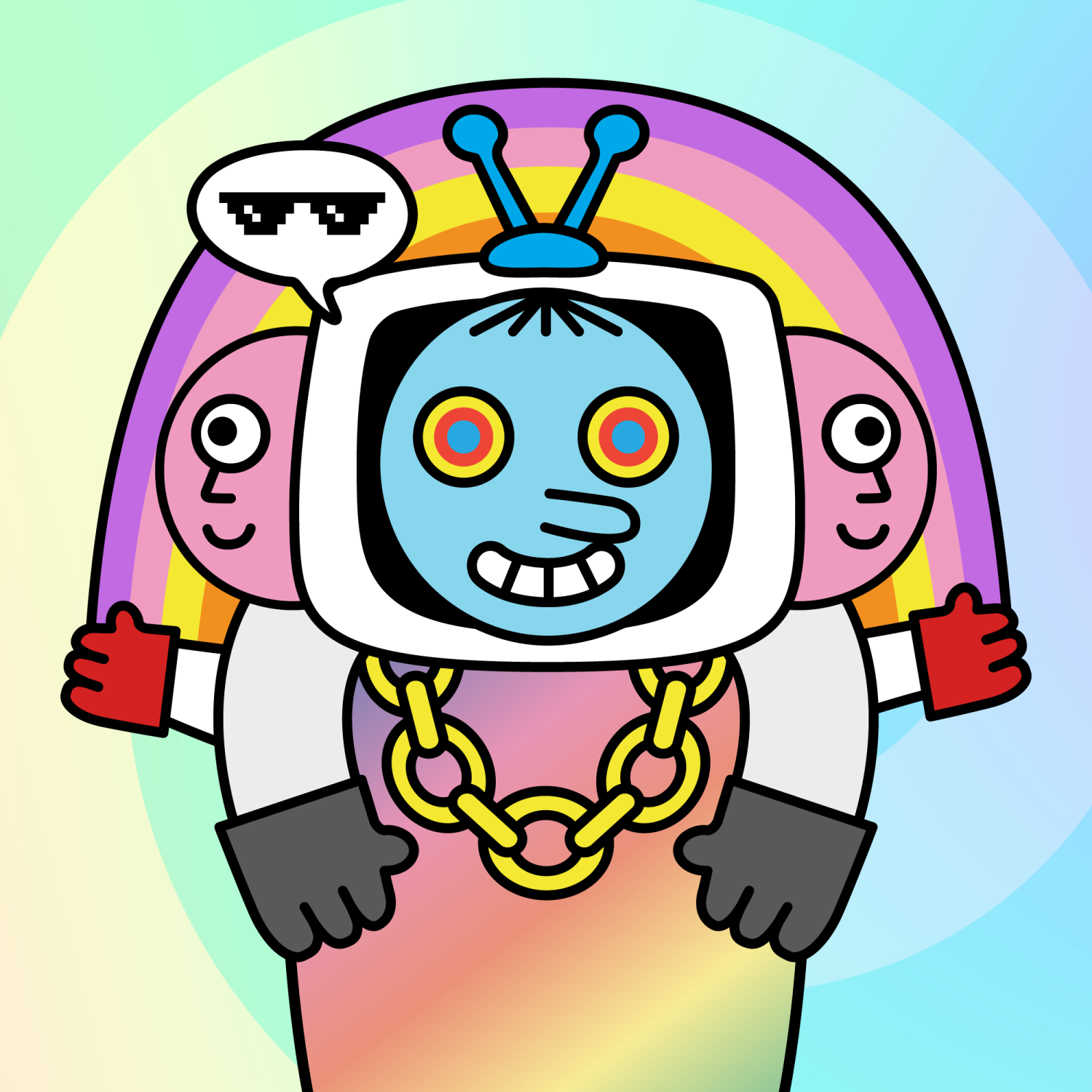 ArmsWhite33.38%BackgroundOcean3.29%DialogueThug3.31%EyesHypno1.47%Face ColourSky3.69%HairStraight Fringe9.68%Head MiddleFocused1.80%Head TopBlue Antenna1.72%Left HandGrey28.85%MouthTeethy10.18%NoseLong11.53%Right HandGrey28.85%ShirtMagic Gold Chain0.39%Special ToolSunset Rainbow0.35%TribeConnector20.00%