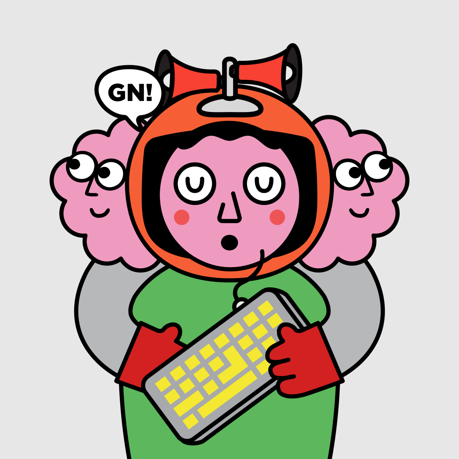 ArmsGrey31.22%BackgroundNeutral10.23%CheekRosy23.73%DialogueGN!10.28%EyesSleepy5.84%Face ColourStrawberry46.38%HairV-Shaped9.72%Head MiddleFluffy1.15%Head TopMegaphone0.83%Left HandRed32.25%MouthPouty10.05%NoseTriangle21.33%PropKeyboard0.64%Right HandRed32.25%ShirtPlain Green9.09%TribeConnector20.00%