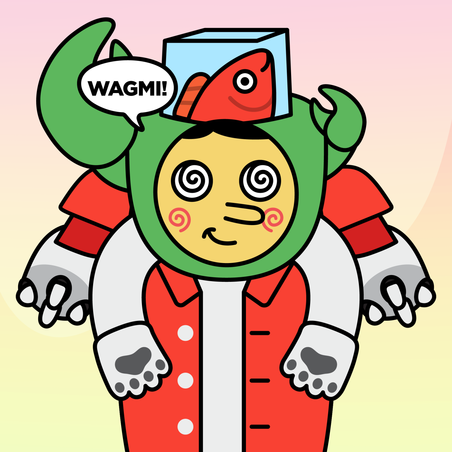 ArmsWhite33.38%BackgroundDawn3.29%CheekSpiral16.18%DialogueWAGMI!3.23%EyesDizzy6.21%Face ColourLemon23.14%HairSide Fringe10.18%Head MiddleBig Green Claw0.89%Head TopFish2.15%Left HandWhite Paw1.74%MouthSmirk19.13%NoseLong11.53%Right HandWhite Paw1.74%ShirtRed Shirt1.47%Special ToolRed Machine0.33%TribeBuilder19.99%