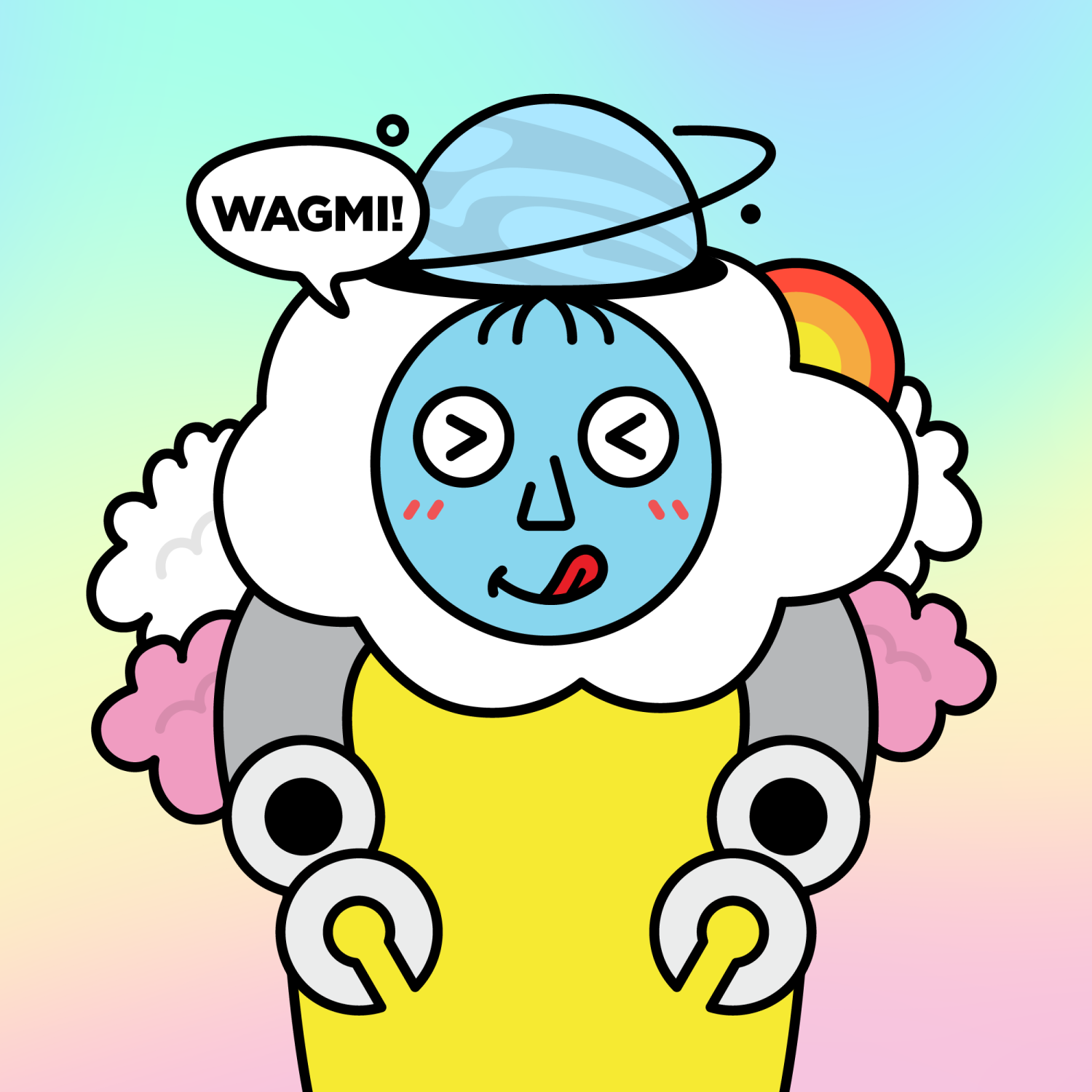 ArmsGrey31.22%BackgroundBeach3.75%CheekBlush3.68%DialogueWAGMI!3.23%EyesScrunched5.58%Face ColourSky3.69%HairSparse Fringe10.04%Head MiddleRainbow Cloud1.01%Head TopWater1.36%Left HandRobot3.43%MouthYummy1.92%NoseTriangle21.33%Right HandRobot3.43%ShirtPlain Yellow7.90%Special ToolDawn Sky0.65%TribeDreamer19.99%