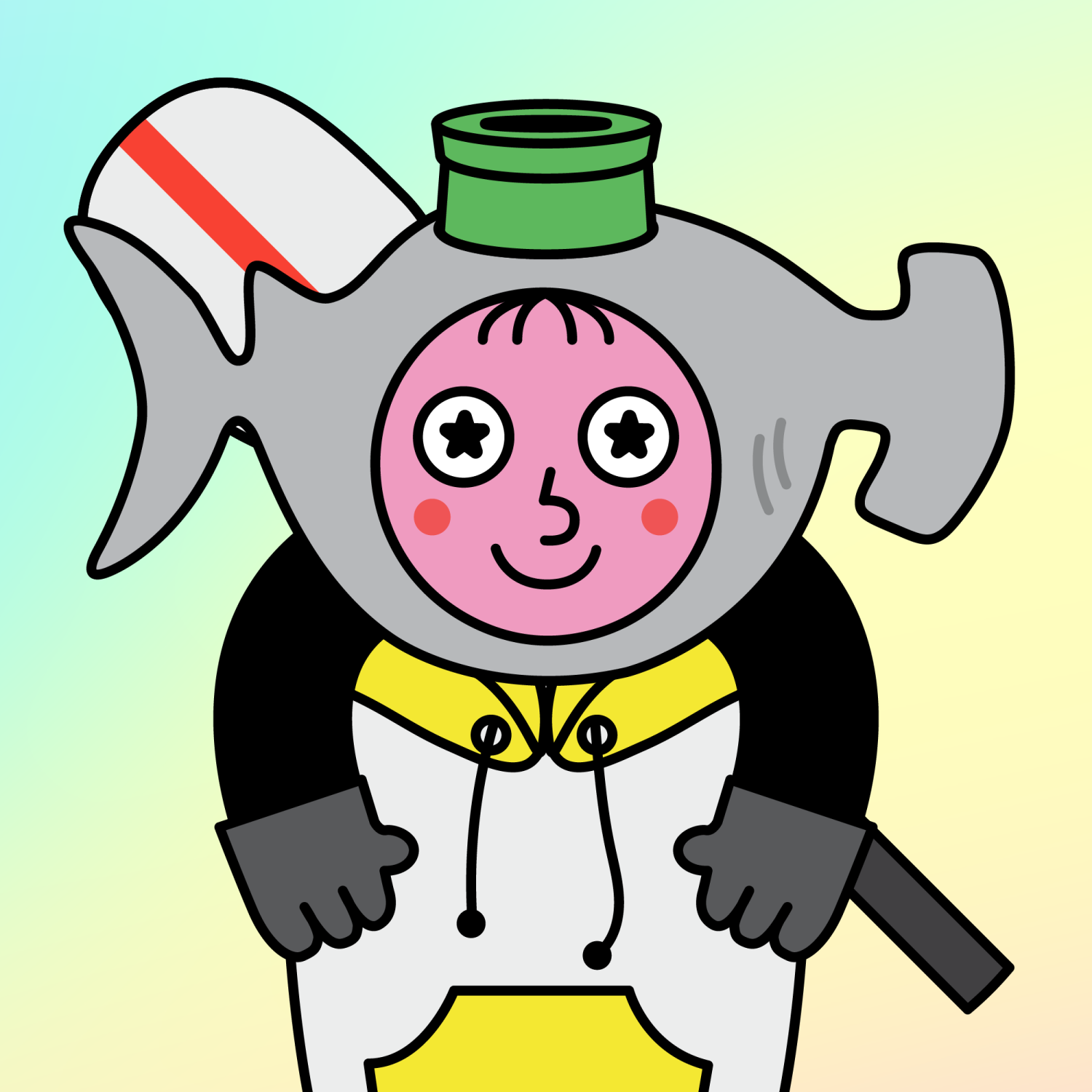ArmsBlack33.28%BackgroundForest4.58%CheekRosy23.73%EyesStarry1.79%Face ColourStrawberry46.38%HairSparse Fringe10.04%Head MiddleGrey Hammerhead Shark0.54%Head TopPipe1.40%Left HandGrey28.85%MouthBig Smile19.64%NoseRound21.67%Right HandGrey28.85%ShirtYellow Hoodie1.41%Special ToolWhite Paddle0.35%TribeNeo-Capitalist20.02%