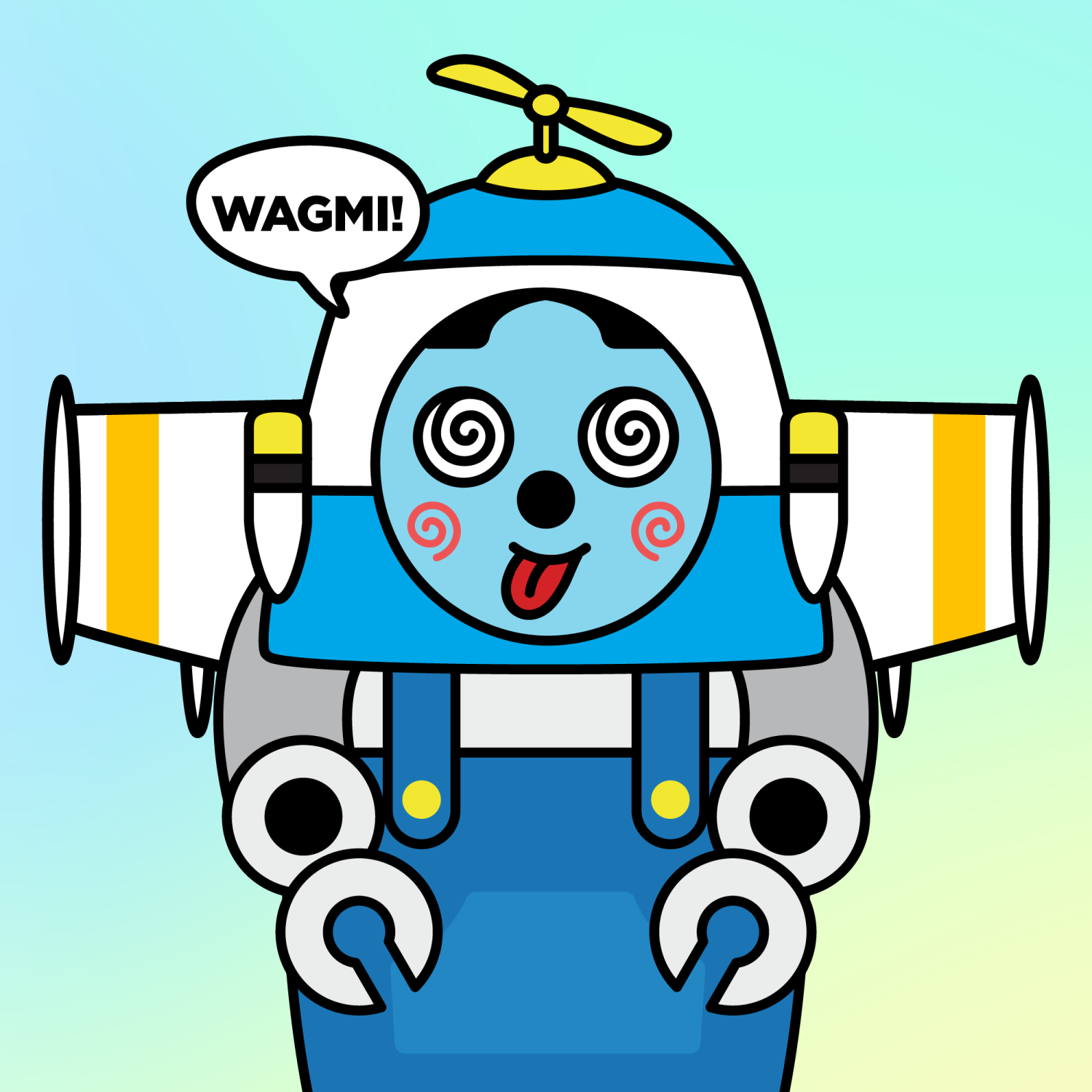 ArmsGrey31.22%BackgroundRainforest4.70%CheekSpiral16.18%DialogueWAGMI!3.23%EyesDizzy6.21%Face ColourSky3.69%HairCentre Parting10.07%Head MiddleBlue Rocket2.15%Head TopPropellor0.27%Left HandRobot3.43%MouthTongue Out2.06%NoseBlack3.70%Right HandRobot3.43%ShirtBlue Dungarees0.80%Special ToolParaglider0.70%TribeAngel19.99%