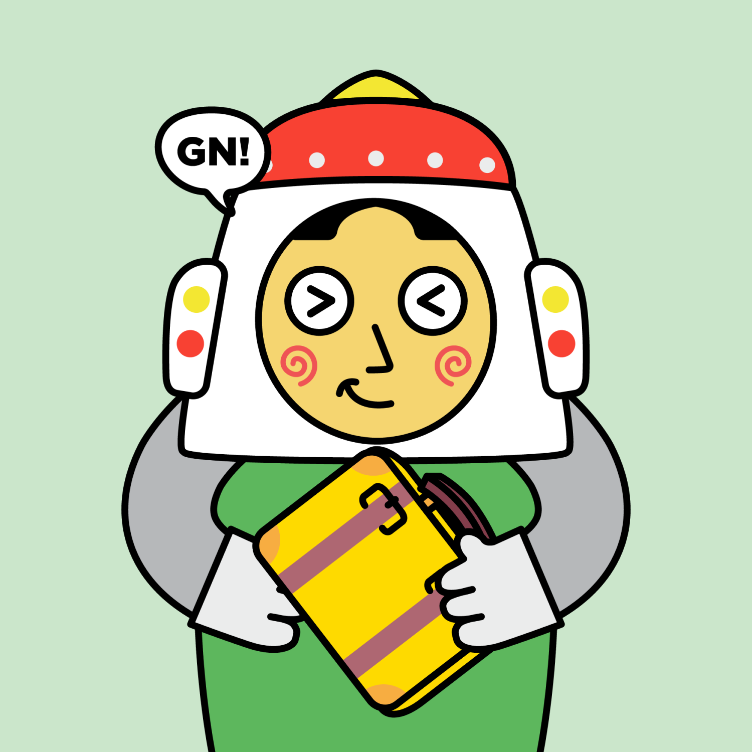 ArmsGrey31.22%BackgroundNature11.30%CheekSpiral16.18%DialogueGN!10.28%EyesScrunched5.58%Face ColourLemon23.14%HairCentre Parting10.07%Head MiddleWhite Helmet1.97%Head TopRed Robot1.83%Left HandWhite30.00%MouthSmirk19.13%NoseSharp23.13%PropSuitcase0.45%Right HandWhite30.00%ShirtPlain Green9.09%TribeAngel19.99%