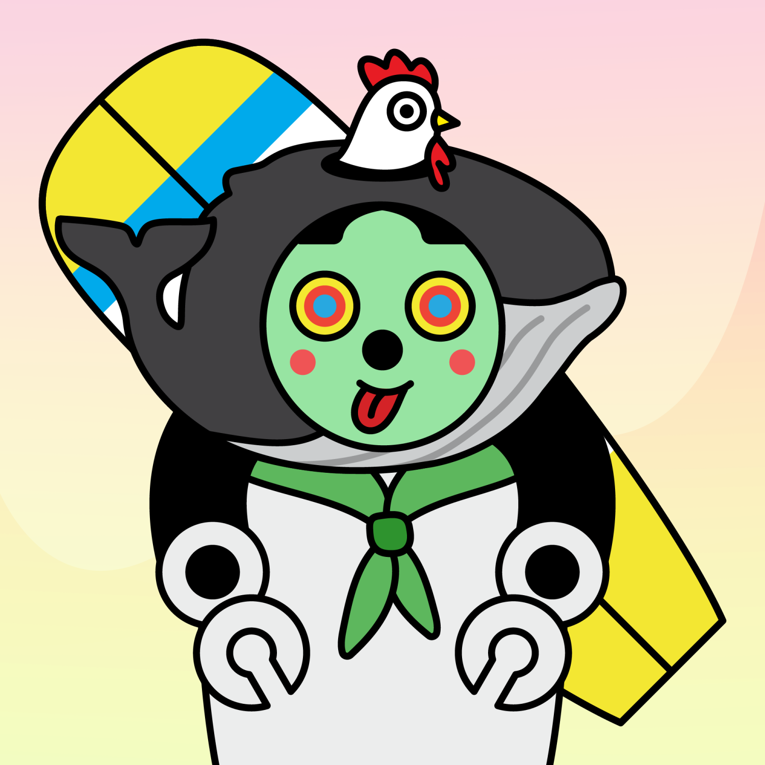 ArmsBlack33.28%BackgroundDawn3.29%CheekRosy23.73%EyesHypno1.47%Face ColourAlien3.81%HairCentre Parting10.07%Head MiddleBlack Humpback Whale0.25%Head TopHen0.24%Left HandRobot3.43%MouthTongue Out2.06%NoseBlack3.70%Right HandRobot3.43%ShirtGreen Bandana1.31%Special ToolYellow Board0.32%TribeNeo-Capitalist20.02%