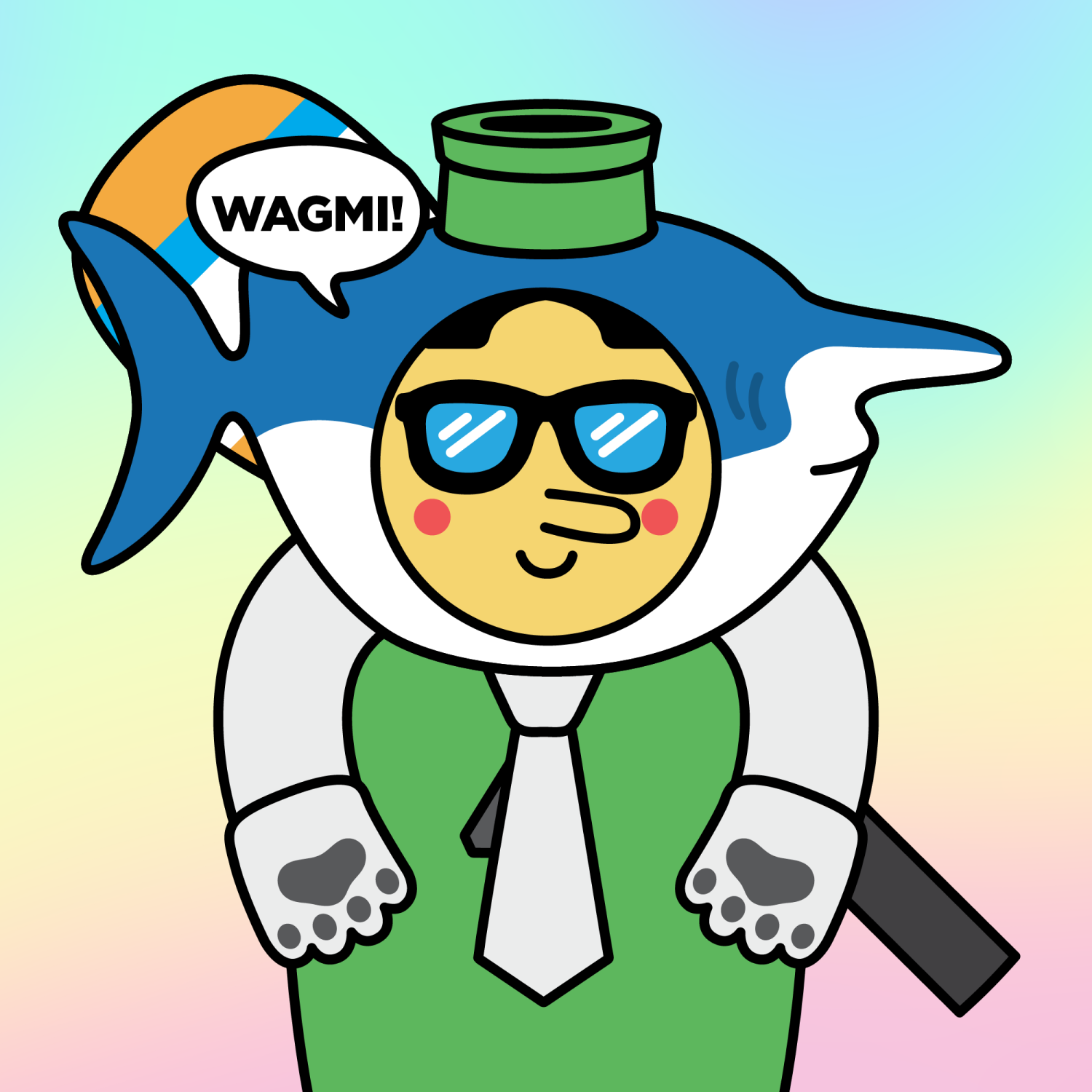 ArmsWhite33.38%BackgroundBeach3.75%CheekRosy23.73%DialogueWAGMI!3.23%EyesBossy1.01%Face ColourLemon23.14%HairCentre Parting10.07%Head MiddleBlue Goblin Shark0.53%Head TopPipe1.40%Left HandWhite Paw1.74%MouthSmile21.06%NoseLong11.53%Right HandWhite Paw1.74%ShirtWhite Tie0.75%Special ToolOrange Paddle0.33%TribeNeo-Capitalist20.02%