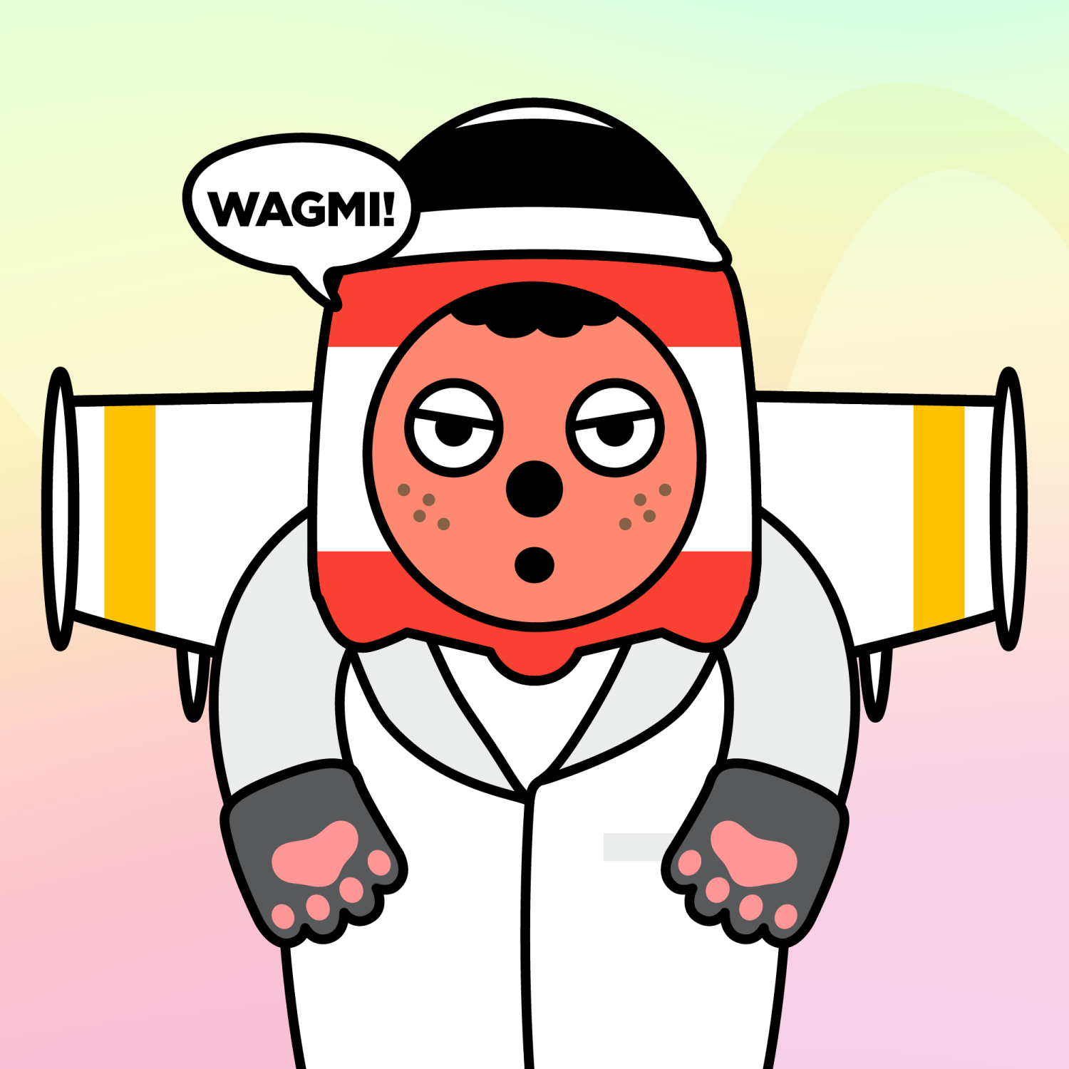 ArmsWhite33.38%BackgroundDusk3.29%CheekFreckles3.67%DialogueWAGMI!3.23%EyesGrumpy5.74%Face ColourOrange22.69%HairCloud Fringe9.72%Head MiddleRed Fizz0.26%Head TopBlack Beanie1.49%Left HandGrey Paw1.62%MouthPouty10.05%NoseBlack3.70%Right HandGrey Paw1.62%ShirtWhite Suit0.80%Special ToolParaglider0.70%TribeAngel19.99%
