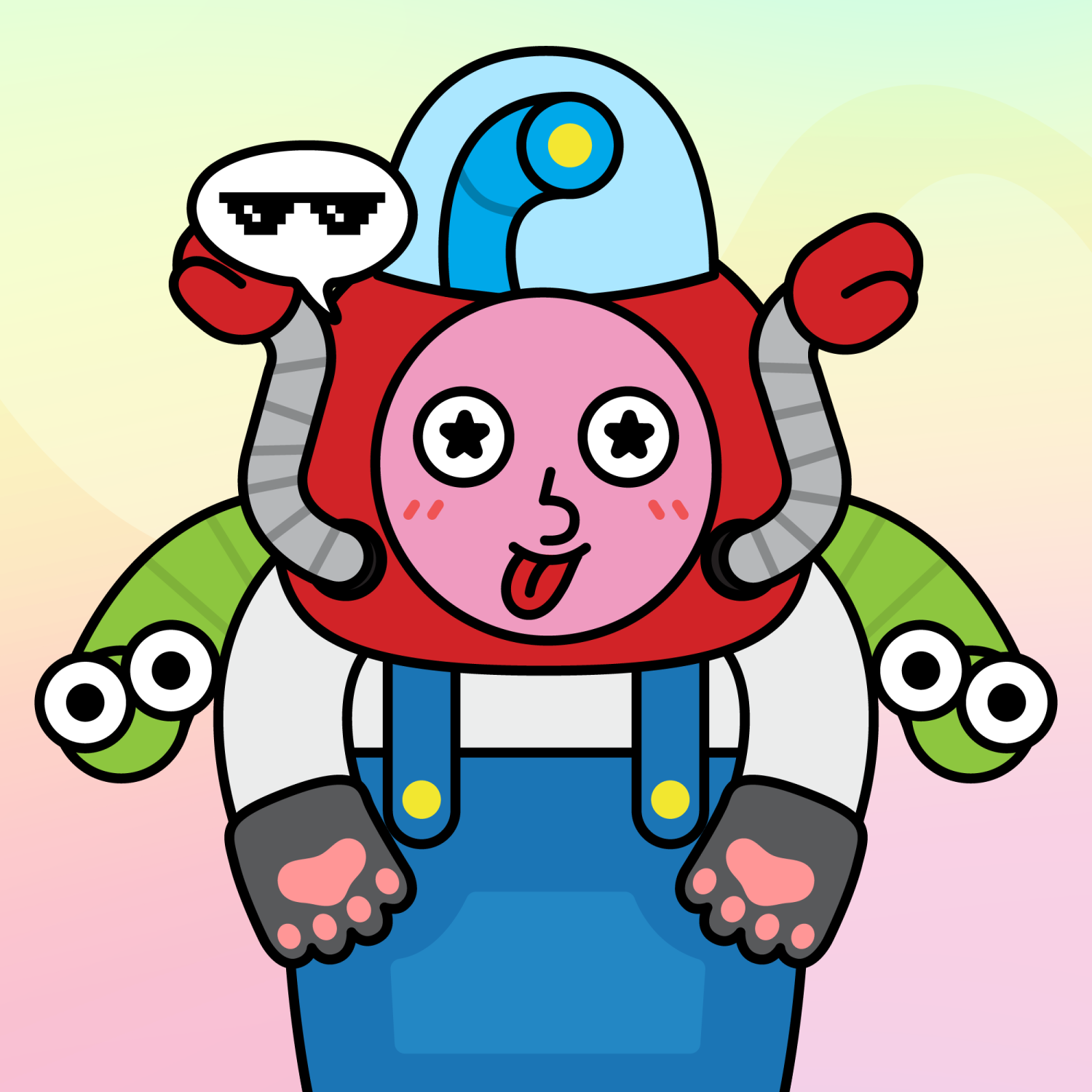 ArmsWhite33.38%BackgroundDusk3.29%CheekBlush3.68%DialogueThug3.31%EyesStarry1.79%Face ColourStrawberry46.38%Head MiddleRed Bot0.27%Head TopBlue Periscope1.96%Left HandGrey Paw1.62%MouthTongue Out2.06%NoseRound21.67%Right HandGrey Paw1.62%ShirtBlue Dungarees0.80%Special ToolWorms0.68%TribeBuilder19.99%