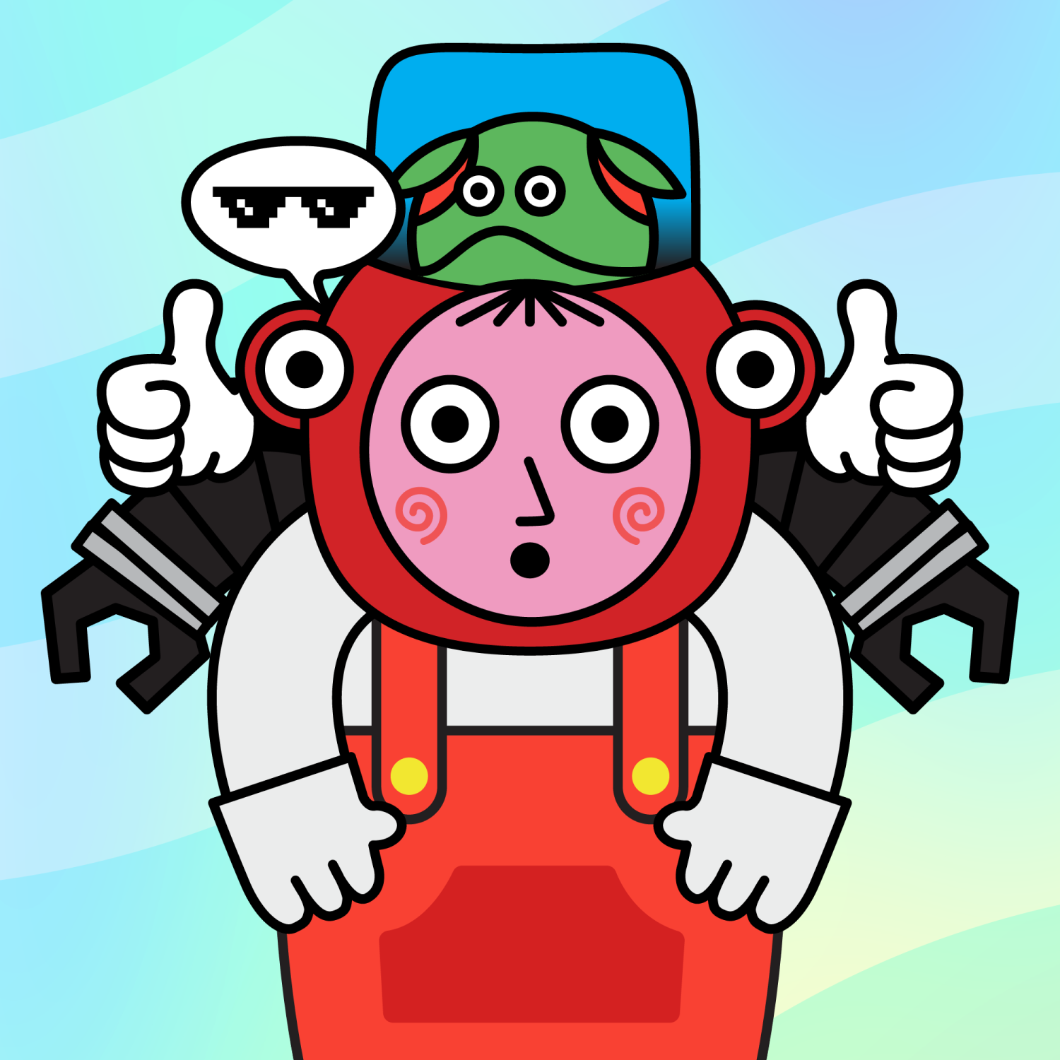 ArmsWhite33.38%BackgroundWave3.36%CheekSpiral16.18%DialogueThug3.31%EyesTwo14.58%Face ColourStrawberry46.38%HairStraight Fringe9.68%Head MiddleThumbs Up0.27%Head TopGreen Fren0.24%Left HandWhite30.00%MouthPouty10.05%NoseSharp23.13%Right HandWhite30.00%ShirtRed Dungarees1.20%Special ToolDark Robot0.98%TribeBuilder19.99%