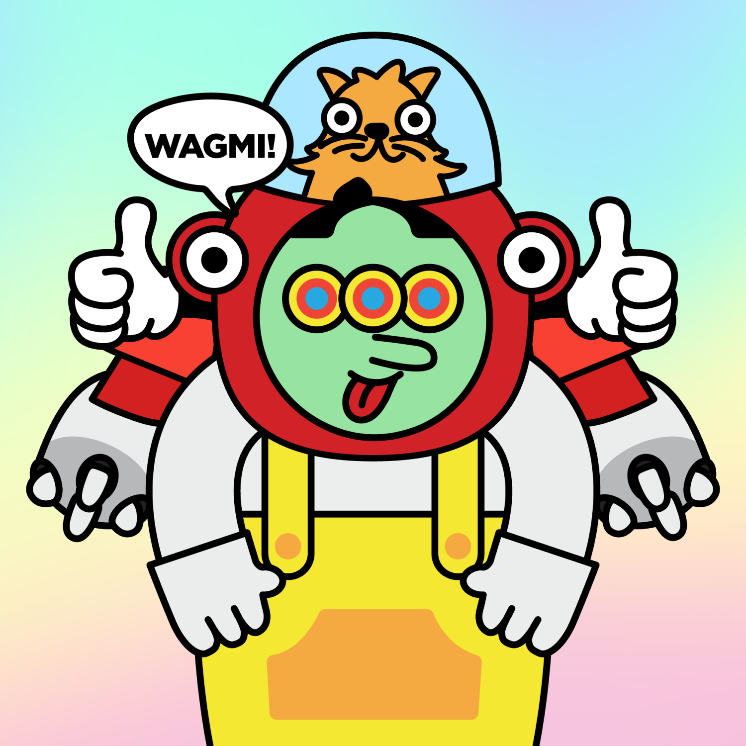 ArmsWhite33.38%BackgroundBeach3.75%DialogueWAGMI!3.23%EyesTriple Hypno1.53%Face ColourAlien3.81%HairCentre Parting10.07%Head MiddleThumbs Up0.27%Head TopCryptoKitties1.00%Left HandWhite30.00%MouthTongue Out2.06%NoseLong11.53%Right HandWhite30.00%ShirtYellow Dungarees0.77%Special ToolRed Machine0.33%TribeBuilder19.99%