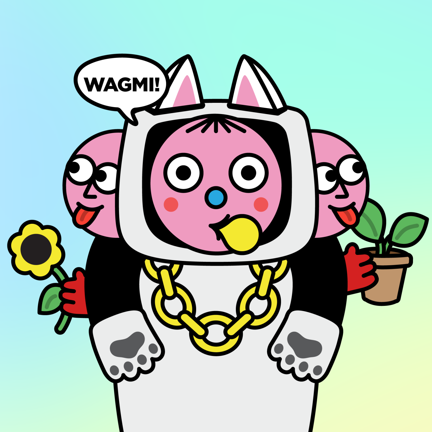 ArmsBlack33.28%BackgroundRainforest4.70%CheekRosy23.73%DialogueWAGMI!3.23%EyesTwo14.58%Face ColourStrawberry46.38%HairStraight Fringe9.68%Head MiddleCheeky1.81%Head TopWhite Cat0.32%Left HandWhite Paw1.74%MouthBubble Gum2.01%NoseBlue3.76%Right HandWhite Paw1.74%ShirtWhite Gold Chain0.74%Special ToolPlants0.45%TribeConnector20.00%