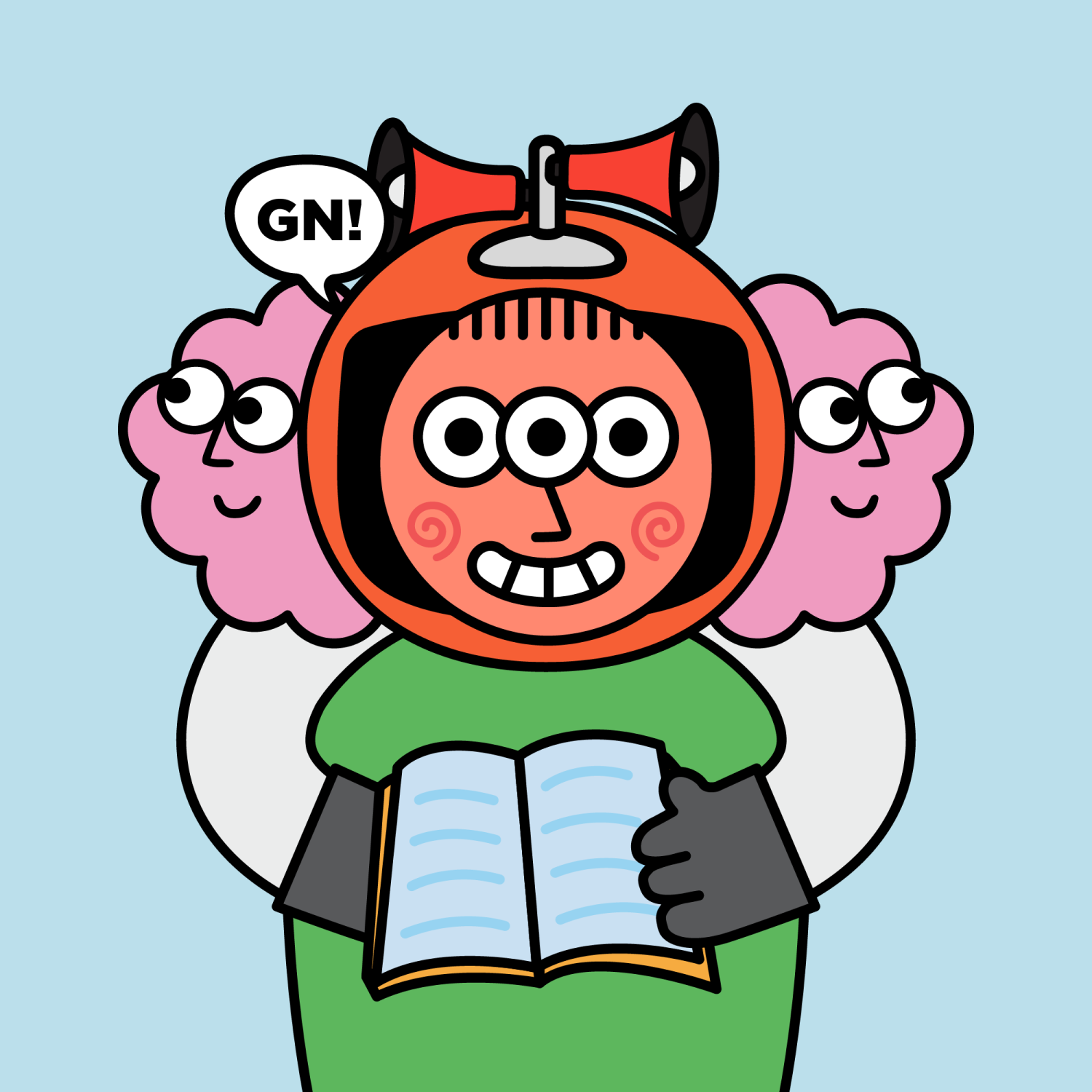 ArmsWhite33.38%BackgroundSky13.97%CheekSpiral16.18%DialogueGN!10.28%EyesThree15.53%Face ColourOrange22.69%HairThin Fringe10.61%Head MiddleFluffy1.15%Head TopMegaphone0.83%Left HandGrey28.85%MouthTeethy10.18%NoseSharp23.13%PropOpen Book0.51%Right HandGrey28.85%ShirtPlain Green9.09%TribeConnector20.00%
