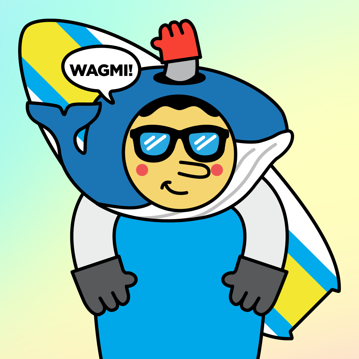 ArmsWhite33.38%BackgroundForest4.58%CheekRosy23.73%DialogueWAGMI!3.23%EyesBossy1.01%Face ColourLemon23.14%HairV-Shaped9.72%Head MiddleBlue Humpback Whale0.27%Head TopGlove0.89%Left HandGrey28.85%MouthSmirk19.13%NoseLong11.53%Right HandGrey28.85%ShirtPlain Blue6.31%Special ToolYellow Paddleboard0.33%TribeNeo-Capitalist20.02%