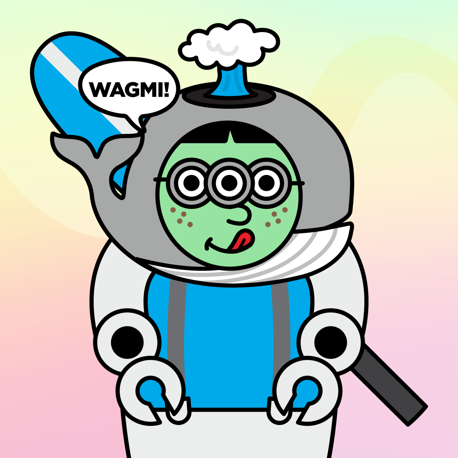 ArmsWhite33.38%BackgroundDusk3.29%CheekFreckles3.67%DialogueWAGMI!3.23%EyesTriple Goggles1.40%Face ColourAlien3.81%HairThick Fringe9.57%Head MiddleGrey Blue Whale0.26%Head TopSmoke1.37%Left HandRobot3.43%MouthYummy1.92%NoseButton10.78%Right HandRobot3.43%ShirtGrey Harness1.22%Special ToolBlue Paddle0.32%TribeNeo-Capitalist20.02%
