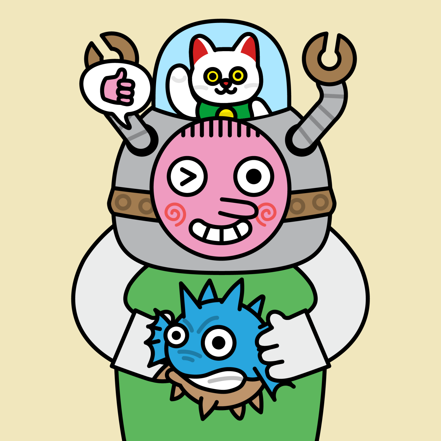 ArmsWhite33.38%BackgroundEarth11.50%CheekSpiral16.18%DialogueThumbs Up11.09%EyesWinking6.44%Face ColourStrawberry46.38%HairThin Fringe10.61%Head MiddleBronze Robot1.55%Head TopNeko1.09%Left HandWhite30.00%MouthTeethy10.18%NoseLong11.53%PropBlowfish Plushie0.65%Right HandWhite30.00%ShirtPlain Green9.09%TribeBuilder19.99%