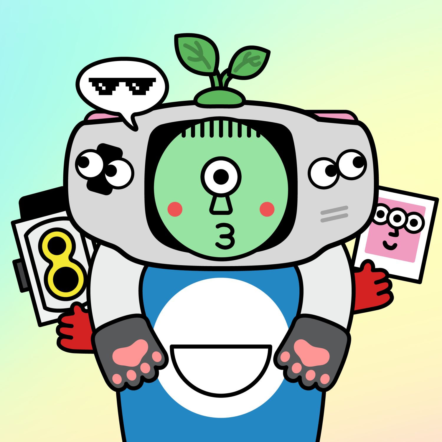 ArmsWhite33.38%BackgroundForest4.58%CheekRosy23.73%DialogueThug3.31%EyesOne14.86%Face ColourAlien3.81%HairThin Fringe10.61%Head MiddleGrey Gamer0.39%Head TopGrass0.27%Left HandGrey Paw1.62%MouthO11.24%NoseTriangle21.33%Right HandGrey Paw1.62%ShirtBlue Cat0.39%Special ToolCamera0.60%TribeConnector20.00%