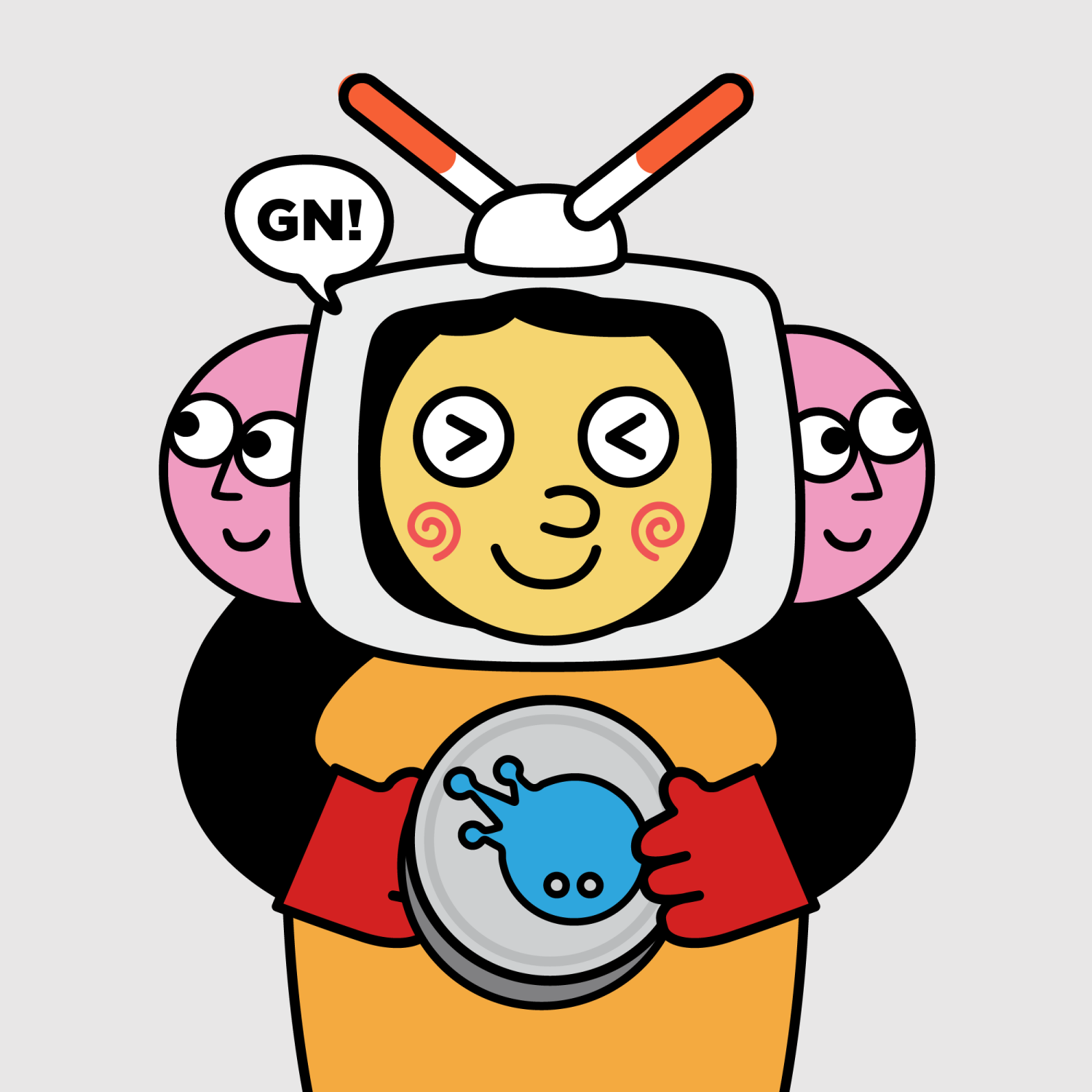 ArmsBlack33.28%BackgroundNeutral10.23%CheekSpiral16.18%DialogueGN!10.28%EyesScrunched5.58%Face ColourLemon23.14%HairSide Fringe10.18%Head MiddleHappy1.88%Head TopTV Antenna1.01%Left HandRed32.25%MouthBig Smile19.64%NoseButton10.78%PropAB Crown0.50%Right HandRed32.25%ShirtPlain Orange7.35%TribeConnector20.00%
