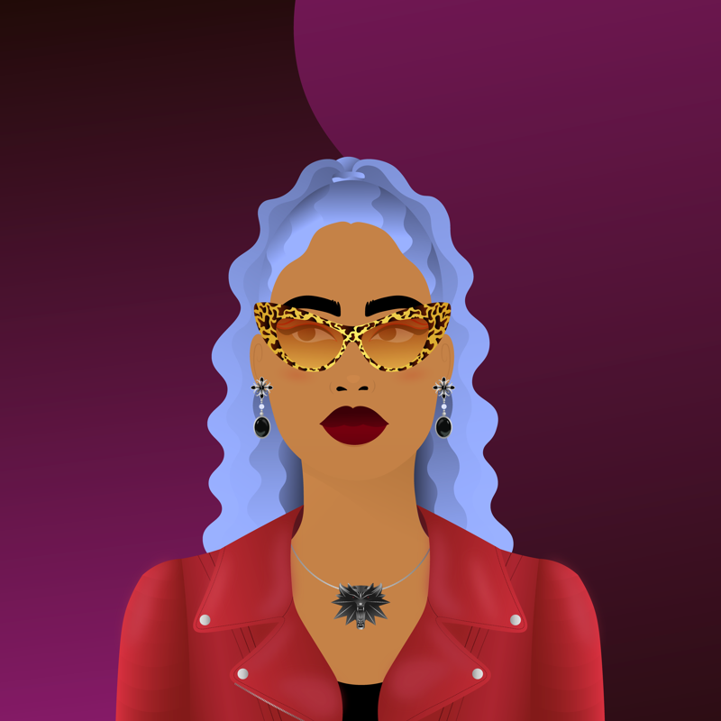 BackgroundDark Purple8.76%ClothesRed Leather Jacket3.74%EarringsEmpresses Of Darkness1.03%EyesBrown To The Right4.55%Face AccessoriesCateye Sunglasses2.21%Facial FeaturesRed Eyeliner6.08%HairstyleCurly Ponytail3.90%Lips ColorBurgundy19.95%MouthSlight Smile16.66%NecklaceWolf Pendant2.29%Skin ToneMedium Gold9.37%