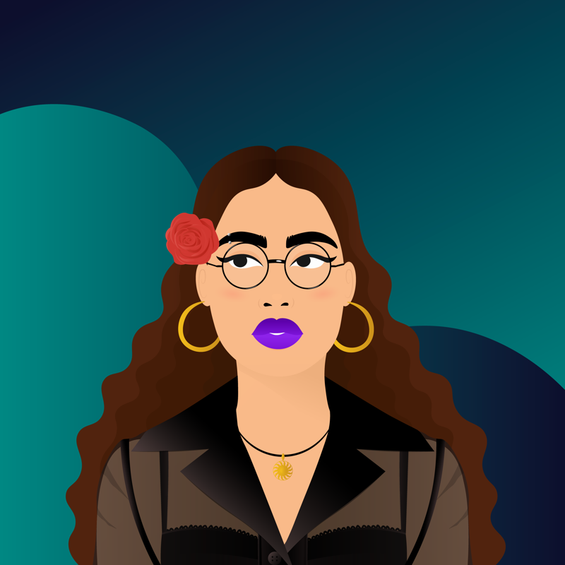 BackgroundDark Emerald9.24%Clothes80s Silk Shirt4.00%EarringsClassic Hoops7.80%EyesBlack To The Right8.70%Face AccessoriesRound Glasses7.04%Facial FeaturesEyebrow Piercing6.19%HairstyleRose Hair3.88%Lips ColorPurple19.67%MouthSlightly Open16.61%NecklaceSun Keeper7.30%Skin ToneLight Warm Yellow10.21%