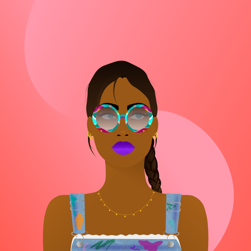 BackgroundPink Pastel8.49%ClothesPainter's Overall5.50%EarringsTriple Rings8.23%EyesBlue To The Left4.07%Face AccessoriesPsychedelic Sunglasses3.90%Facial FeaturesFreckles5.81%HairstyleBraided Ponytail5.61%Lips ColorPurple19.67%MouthSlight Smile16.66%NecklaceGolden Flakes7.10%Skin ToneDeep Warm Gold10.26%