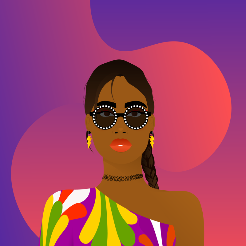 BackgroundPurple Pink9.05%ClothesPsychedelic Dress4.92%EarringsLightning Bolts2.26%EyesBrown Straight4.34%Face AccessoriesBlack Round Retro4.03%Facial FeaturesRed Eyeliner6.08%HairstyleBraided Ponytail5.61%Lips ColorPassion Red30.08%MouthSlightly Open16.61%NecklaceBack To The 90s7.06%Skin ToneDeep Warm Gold10.26%
