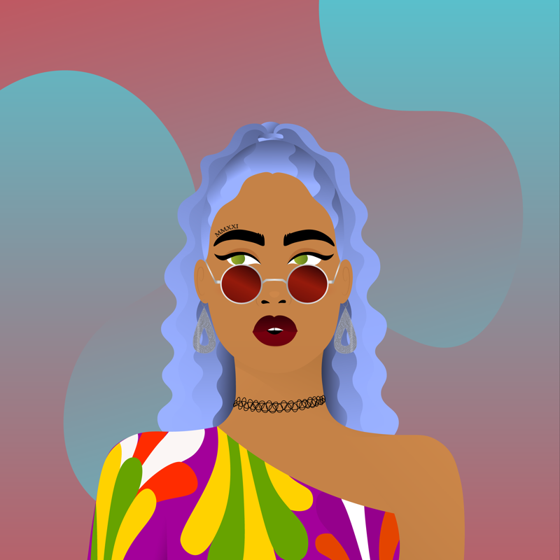 BackgroundRed Turquoise9.14%ClothesPsychedelic Dress4.92%EarringsSilver Drops8.22%EyesGreen To The Right4.10%Face AccessoriesRed Round Sunglasses6.95%Facial FeaturesEyebrow Tattoo MMXXI3.03%HairstyleCurly Ponytail3.90%Lips ColorBurgundy19.95%MouthSurprised17.33%NecklaceBack To The 90s7.06%Skin ToneMedium Gold9.37%